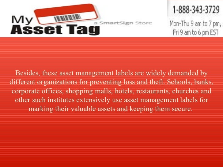 Asset Management Labels Asset Management Labels Control of your two most elusive assets, furniture and equipment, can be easily accomplished with the use of auto ID technology. By assigning a unique number to each movable item, a database can be created controlling the movement, storage and retrieval of equipment and furniture.